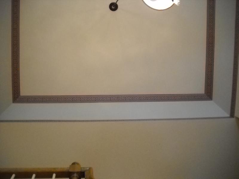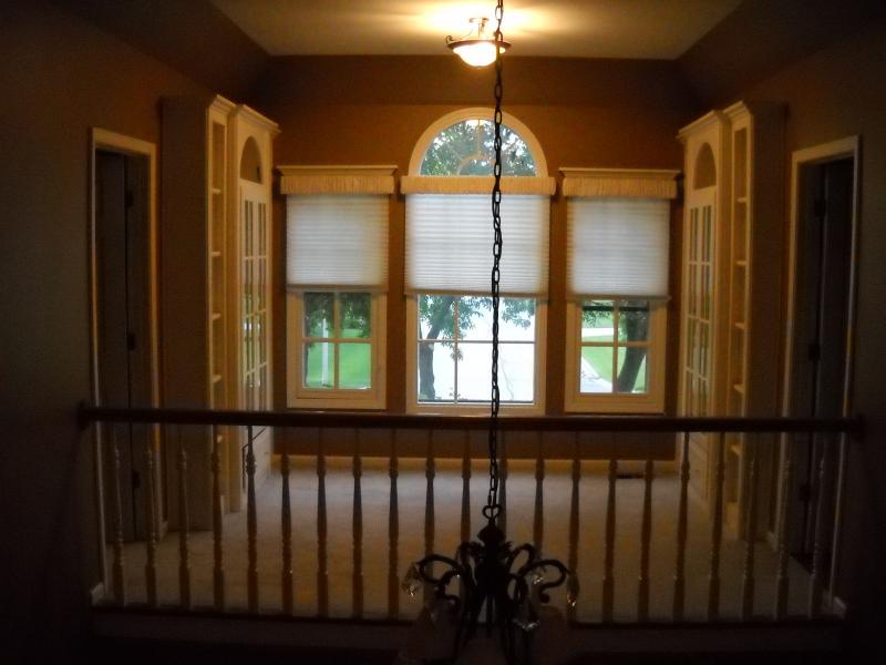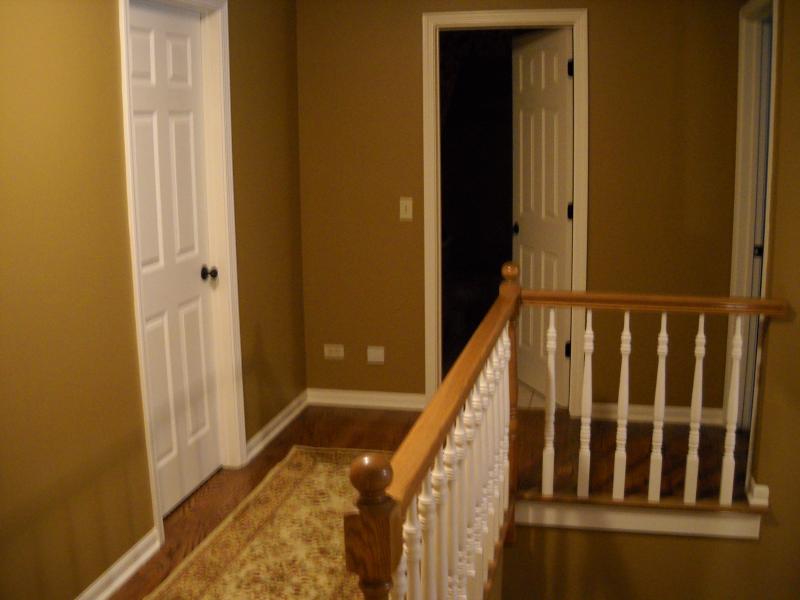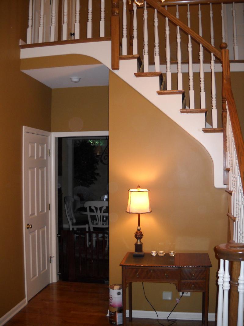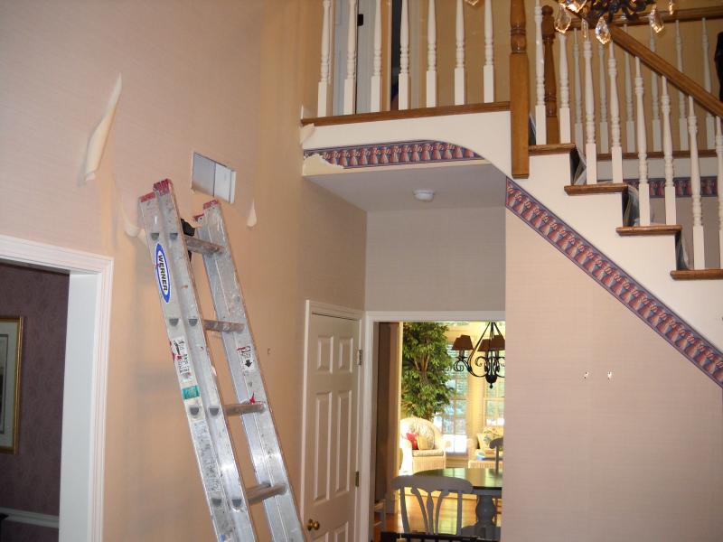 2 Story Foyer Had wallpaper that was on for many years ! So I removed paper, washed walls ,did repairs ,primed and painted ceiling linen white ,walls with Duration paint ...Matte finish. Trim and doors semi-gloss . And in loft area , bookcases repainted