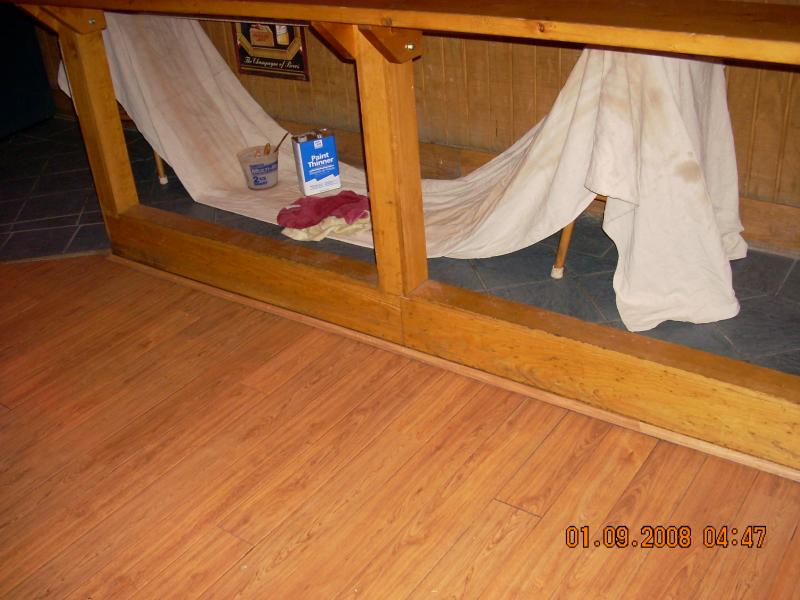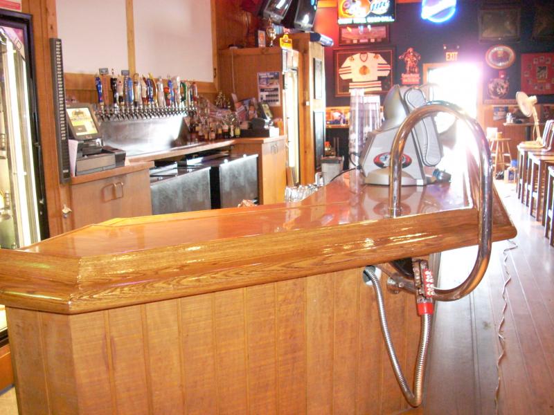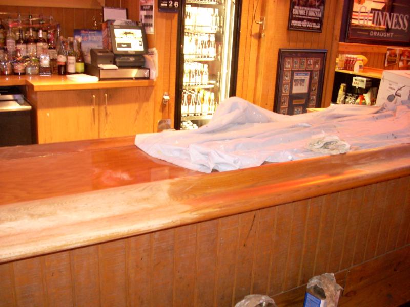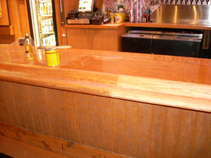 Left side no stain , The right side is in its original shape . It was in a gummy state , The finish had a breakdown and wasn't doing its job . So I was brought in to redo the oak bar ledge and a island that also had a oak ledge . Also added a high gloss top coat to all sill and window ledges .