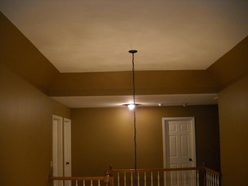 2 Story Foyer Had wallpaper that was on for many years ! So I removed paper, washed walls ,did repairs ,primed and painted ceiling linen white ,walls with Duration paint ...Matte finish. Trim and doors semi-gloss . And in loft area , bookcases repainted