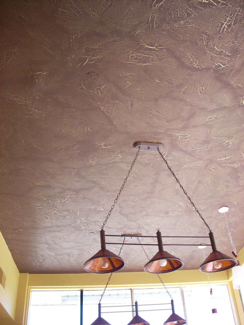 I help take a sandwich place and turn it into a restaurant.we used a polyurethane paint on wall and ceiling and a chemical resistant epoxy on the floors in kitchen.On the dining room ceiling and 2 arches and a section of lower chair rail I put a crackle finish with metalic gold cracks. Lou and Mike (the owners) have seen an increase in customers .